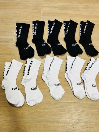 Lote de 10 pares de ciclismo a estrenar en color blanco y negro. Modelo Unisex, talla única, 39-45, se adaptan a la perfección a cualquier perfil de pie adulto. Fabricados en nailon y spandex, pensados para entrenar o competir con la misma comodidad. Sus calidades son similares a un calcetín de compresión incluyendo una mayor circulación y un gran soporte del arco del pie. Ajustados, transpirables y de estilo de caña alta. 💰 Hago lotes y descuentos al comprar más productos de mi perfil.