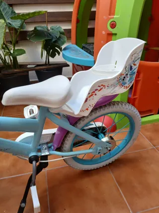 Bicicleta infantil con temática de Frozen, ideal para los más pequeños. Cuenta con un diseño divertido y un asiento trasero para llevar a un muñeco. Con muy poco uso. - Color azul y morado. - Cesta delantera. - Ruedines incluidos.