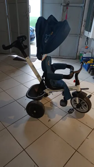 Triciclo evolutivo que se adapta al crecimiento del niño, sirviendo también como carrito. - Diseño en color azul con estrellas. - Capota protectora. - Asiento con arnés de seguridad. - Reposapiés. - Ruedas para fácil movilidad.