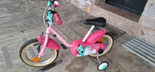 Bicicleta infantil B-Twin con diseño de unicornio. - Color rosa. - Ruedines incluidos. - Pedales con diseño. - Puños de goma. Muy poco uso!!!
