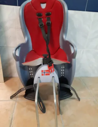 Silla para bicicleta infantil. Cuenta con un asiento acolchado en color rojo y cinturones de seguridad. - Asiento acolchado rojo. - Cinturones de seguridad negros. - Diseño con bandera de Noruega.