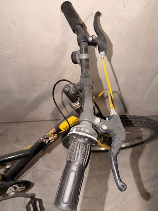 Bicicleta infantil B'twin en color negro y amarillo, ideal para niños de 6 a 9 años. - Cuadro de acero. - Ruedas de 20 pulgadas. - Frenos V-brake. - Sillín ajustable. - Guardabarros delantero y trasero. Tiene algún roce del uso pero funciona correctamente. Ruedas en buen estado.