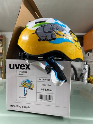 Casco de bicicleta Uvex para niños, con un divertido diseño de animales y un mapa del mundo. Ideal para proteger a los más pequeños en sus aventuras. - Talla ajustable: 46-52 cm. - Diseño colorido con león y elefante. - Marca: Uvex. - pvp nuevo: 30-35€ Dispongo de 2 unidades.