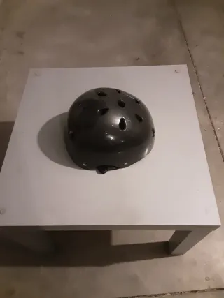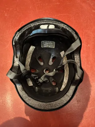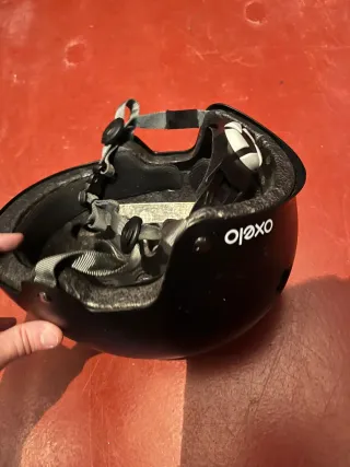 Casco protector de color negro, ideal para actividades deportivas. - Diseño interior con acolchado. - Correas ajustables con cierre de hebilla. - Múltiples orificios para ventilación.
