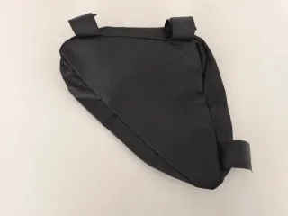 Bolsa triangular de color negro, diseñada para bicicletas. Es práctica y fácil de acoplar al cuadro. - Material resistente. - Cierre de cremallera. - Correas de sujeción con velcro. - A estrenar.