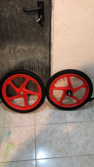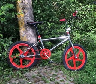 Bicicleta BMX customizada y restaurada. Un diseño único con detalles llamativos. - Cuadro cromado. - Ruedas y cadena en color rojo. - Manillar y sillín a juego. - Las cubiertas y las llantas son nuevas.