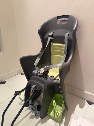 Silla de seguridad para transportar niños en bicicleta. Fabricada en plástico resistente y con acolchado para mayor comodidad. - Arnés de sujeción de 3 puntos. - Reposapiés ajustables. - Diseño ergonómico.