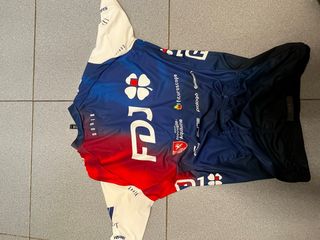 Maillot de ciclismo de manga larga de la marca Gobik, con diseño FDJ. - Diseño degradado en azul, blanco y rojo. - Logos de patrocinadores visibles en la prenda. - Tejido técnico para ciclismo.