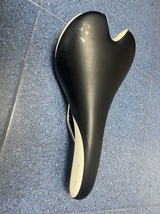 Sillín de bicicleta de carretera de la marca Fizik. Diseño ergonómico y cómodo. - Color negro y blanco. - Carcasa de carbono y railes metálicos con numeración (siempre misma posición sillín). Hace algo de ruido el chasis con la carcasa, yo lo soluciono echándole una gota de aceite