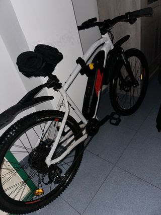 Bicicleta eléctrica de color blanco, ideal para desplazamientos urbanos o rutas - Ruedas todoterreno. - Batería integrada en el cuadro. - Suspensión delantera.