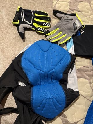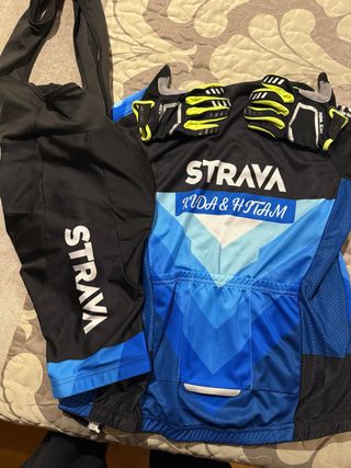 Conjunto de ciclismo para niño que incluye maillot y culotte, junto con un par de guantes. - Maillot y culotte de la marca Strava. - Diseño en tonos azules y negros. - Guantes de ciclismo a juego.