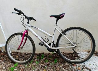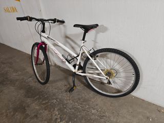 Bicicleta con un diseño deportivo y llamativo. - Cuadro de color blanco. - Horquilla delantera en color rosa. - Sillín negro con detalles rosas.