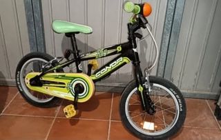 Bicicleta infantil Conor Ray de 14 pulgadas, ideal para niños. Está en buen estado y lista para usar. - Marca: Conor - Modelo: Ray - Tamaño de rueda: 14 pulgadas - Color: Negro y verde lima - Incluye pedales