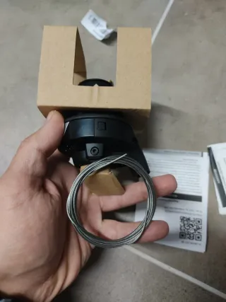 Componente de cambio para bicicleta de la marca Shimano. Se presenta en su embalaje original de cartón. - Incluye cable de cambio. - Botones de ajuste '+' y '-' visibles.