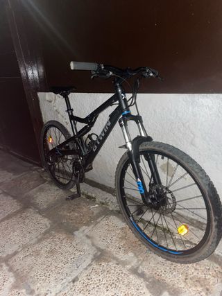 Bicicleta de montaña Btwin en color negro con detalles en azul. Ideal para senderos y terrenos irregulares - - Cuadro de aluminio. - Suspensión delantera. - Frenos de disco.