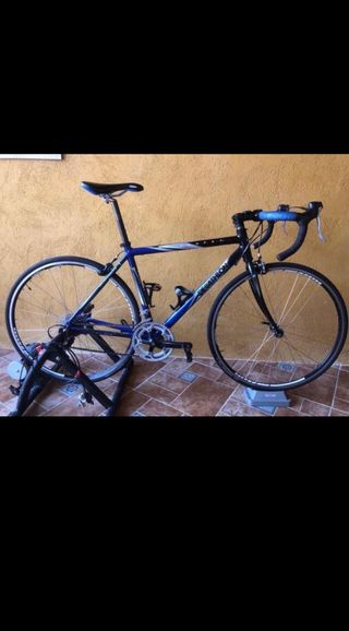 Se vende bici de carretera de marca Decathlon sport 7.1 Talla M En muy buen estado y cuidada solo se a usado en rodillo como se ve en las fotos. Desarrollo: Platos 52/42 Piñones: 11/32 8v Cambio shimano sora Neumatico delantero nuevo Se vende por falta de uso. Entrega en persona. Se vende sin pedales y sin el rodillo. Cualquier duda preguntar.