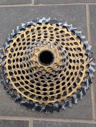 Cassette Sram XX1 Eagle de 520% usado. Está en buen estado, aunque presenta algunos signos de desgaste. - Modelo: Sram XX1 Eagle - Piñones: 520% - Color dorado - 10/50 -Va con cadena Eagle dorada