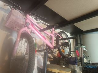 Bicicleta infantil con un diseño blanco y detalles en rosa. Muy buen estado - Ruedas de 16 pulgadas. - Sillín negro con logo. - Guardabarros delantero y trasero.