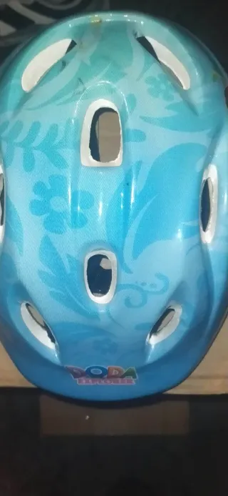 Dos cascos para niños, uno de Dora la exploradora y otro azul con un diseño de una montaña y un águila a cada lado. 5€ cada unidad.