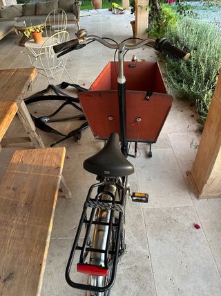 Bicicleta de carga holandesa, ideal para transportar objetos o niños. Incluye candado y funda para la lluvia. - Diseño robusto y espacioso. - Candado de seguridad incluido. - Funda impermeable para protegerla de la lluvia.