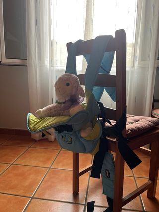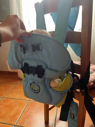 Portabebés de la marca Jane en color azul, con un divertido diseño de smiley. - Tejido acolchado para mayor comodidad. - Correas ajustables. - Cierre de seguridad.