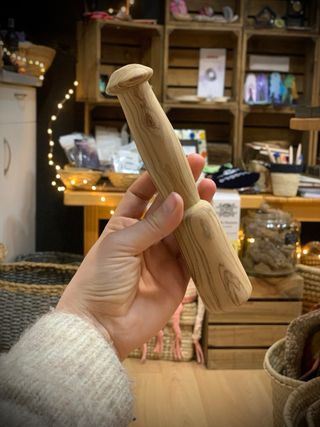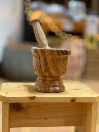 Este mortero está hecho a mano con madera de olivo, lo que le da un aspecto rústico y único.