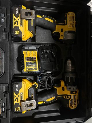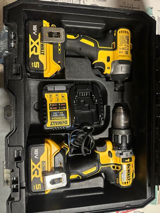 Set de herramientas eléctricas Dewalt. - Taladro percutor inalámbrico. - Atornillador de impacto. - Incluye dos baterías de 18V XR 5Ah. - Cargador rápido DCB1104.