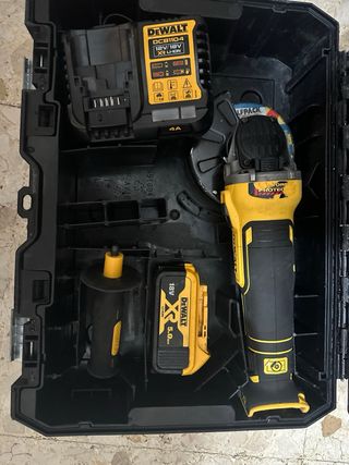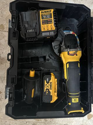 Radial DeWalt en su maletín original, listo para usar. - Incluye radial DeWalt. - Cargador DeWalt DCB1104 (12V/18V). - Batería DeWalt XR Li-Ion 18V 5.0Ah. - Batería DeWalt XR Li-Ion 12V/18V. - Empuñadura auxiliar. - Maletín de transporte.