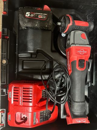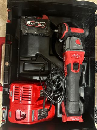 Amoladora angular Milwaukee M18 FUEL con batería de 5.0 Ah y cargador rápido. - Incluye amoladora angular. - Batería REDLITHIUM-ION M18 5.0 Ah. - Cargador rápido RAPIDCHARGE. - Maletín de transporte.