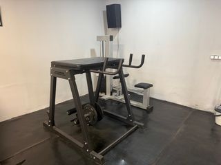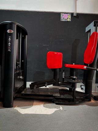 Equipo de gimnasio para entrenamiento de piernas. - Estructura robusta de color negro. - Asiento acolchado. - Soportes para discos de pesas.