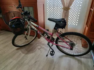 Bicicleta de adulto en color rosa, con su puesta a punto lista para usar. - Incluye casco. - Canasta delantera. - Mochila trasera - Candado - Luces - Portabotella