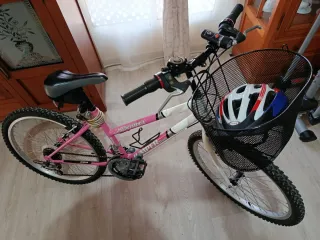 Bicicleta de montaña para mujer adulta, ideal para paseos. - Color rosa y blanco. - Cesta delantera. - luces delanteras y traseras - porta botellas - candado - timbre - casco