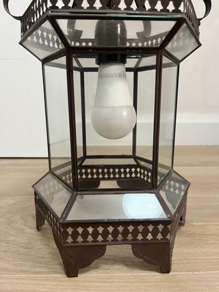Elegante lámpara de estilo vintage con una estructura de metal y detalles en cristal. - Diseño octogonal. - Acabado en tono marrón. - Bombilla LED incluida.