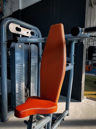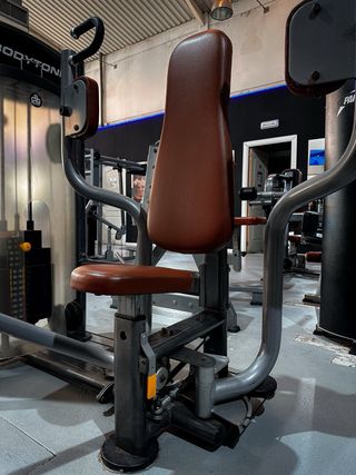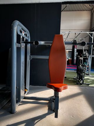 Máquina de gimnasio Fitland para press militar con placas. - Diseño robusto y duradero. - Asiento y respaldo acolchados para mayor comodidad.