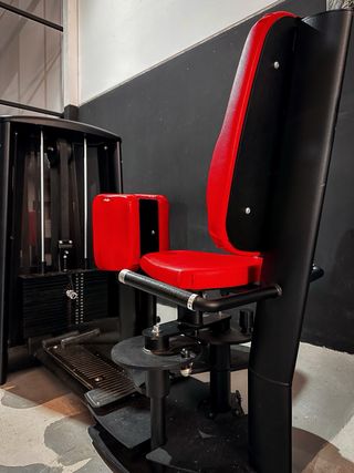 Máquina de gimnasio Gym80 para abductores. - Diseño robusto y profesional. - Tapicería en rojo y negro.