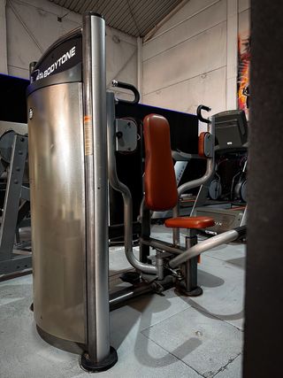 Máquina de gimnasio Bodytone para trabajar la contracción muscular con placas de peso. Ideal para equipar tu gimnasio. - Diseño robusto y duradero. - Tapicería en color marrón. - Estructura metálica plateada.