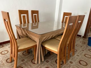 Conjunto de mesa de comedor con seis sillas a juego. Ideal para reuniones familiares o con amigos. - Mesa con superficie de cristal. - Sillas de madera con asientos tapizados. SE VENDE TODO COMPLETO CRISTAL Y CAMILLA