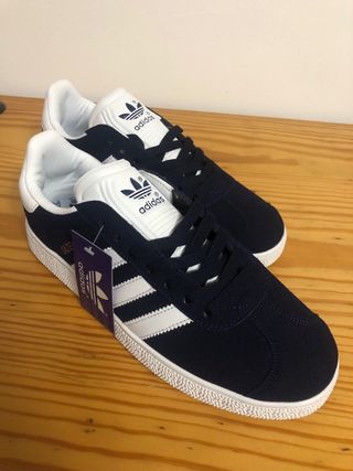 Zapatillas Adidas Gazelle en color azul marino con detalles blancos. - Diseño clásico. - Tres rayas icónicas de Adidas en los laterales. - Logo de Adidas en la lengüeta.