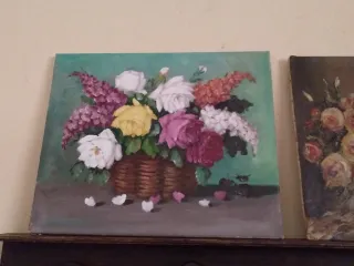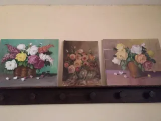 Cuadros decorativos con motivos florales pintados a mano. - Pinturas de flores en cestas y jarrones. - Tonos variados y vibrantes. - Ideales para dar un toque de color a cualquier estancia.