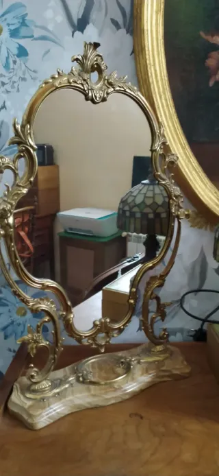Elegante espejo de tocador con un diseño ornamentado y una base de piedra veteada. - Marco de metal con acabado dorado. - Base de mármol piedra natural con vetas. - Diseño barroco. - Forma ovalada del espejo.