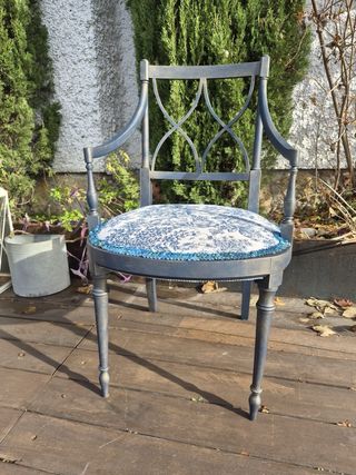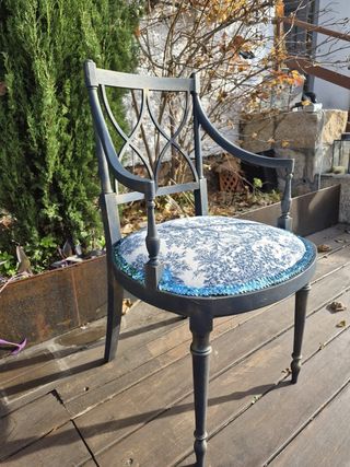 Elegante silla de la Colección Ena, con un diseño clásico y refinado. La Colección se conforma por la silla y una lámpara, también a la venta. La colección completa se vende a un mejor precio, a 130€. - Estructura de madera oscura. - Asiento tapizado con estampado floral azul y blanco. - Detalle de ribete brillante en el asiento.