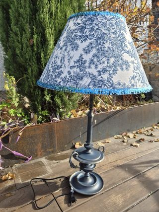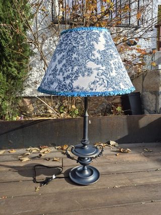 Lámpara de estilo clásico con un diseño elegante. Disponible a la venta la Colección Ena, conformada por una silla y una lámpara a un mejor precio, 130€. - Pantalla con estampado floral azul y blanco. - Base y pie de lámpara en tono oscuro.