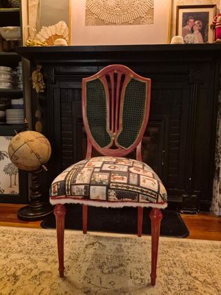 Silla decorativa con un diseño único para coleccionistas. Pertenece a la Colección de Navidad, a conjunto con una lámpara de interior. Toda la Colección se encuentra a la venta por un mejor precio, 130€. - Tapizado con motivos navideños. - Estructura de madera con detalles pintados. - Respaldo con rejilla.