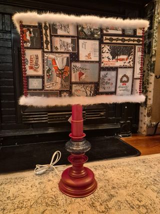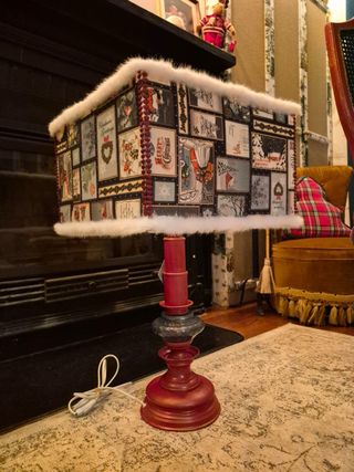 Lámpara de mesa con un diseño único para la temporada navideña. Su pantalla está decorada con imágenes vintage de postales, hecha a mano. La Colección de Navidad, formada por la lámpara y la silla, se encuentra a la venta por un mejor precio, 130€. - Pantalla con motivos navideños estilo retro. - Adorno de pelo sintético blanco en bordes. - Base de lámpara en color rojo con detalles. - Cable de alimentación incluido.