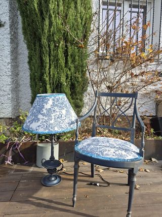 Colección Ena, inspirada en la Reina Victoria Eugenia. Incluye una lámpara y una silla de diseño exclusivo. - Diseño con estampado floral azul y blanco. - Adornos de flecos en la lámpara y la silla.