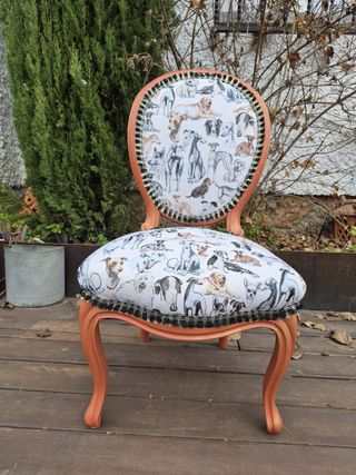 Original silla decorativa con un divertido estampado de perritos. - Tapicería con diseño de perros. - Patas y estructura en color naranja. - Respaldo ovalado con borde decorativo.