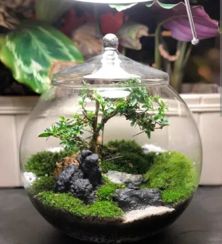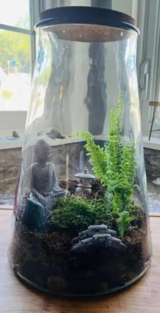 Terrario de cristal con Buda y linterna