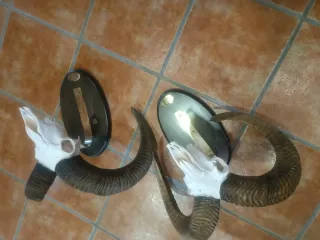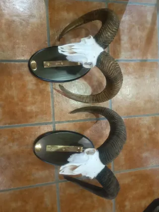 250€ cada uno. Pareja de muflones con sus cuernos montados sobre bases ovaladas de madera oscura, listos para colgar. - Bases de madera oscura. - Soporte metálico para colgar.