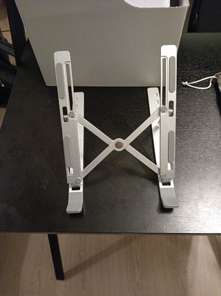 Soporte de aluminio plateado para portátiles de 10 a 15.6 pulgadas. Su diseño plegable lo hace fácil de transportar y almacenar. - Fabricado en aluminio resistente. - Diseño ergonómico y ajustable. - Base antideslizante para mayor estabilidad.