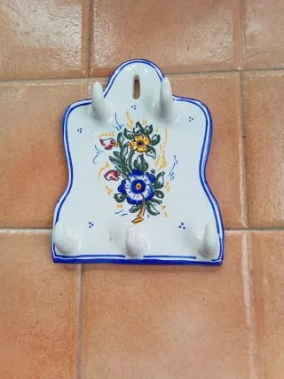 Este colgador de cerámica está decorado con un bonito diseño floral. - Diseño de flores azules y amarillas. - Borde azul. - Con 6 ganchos.